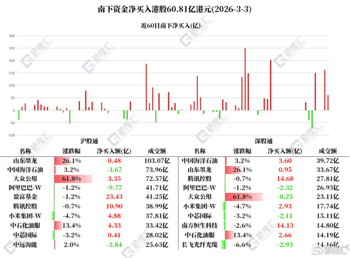 3月3日,南下资金净买入港股60.81亿港元。