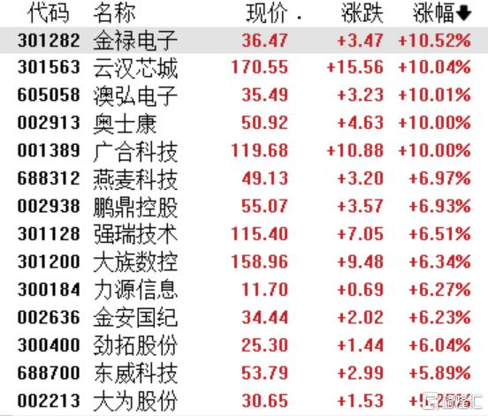 3月18日,PCB概念快速走强,金禄电子、云汉芯城涨超10%,澳弘电子、奥士康、广合科技涨停,鹏鼎控股、强瑞技术、大族数控、金安国纪涨超6%。