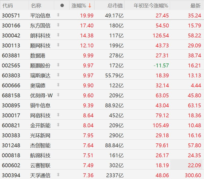 格隆汇3月18日|A股市场算力概念股午后涨幅进一步扩大,其中,平治信息20CM涨停,东方国信涨超17%,朗科科技涨超14%,顺网科技涨超12%,数据港、顺灏股份、瑞斯康达、奥瑞德10CM涨停,优刻得-W、铜牛信息涨超9%,网宿科技、金开新能涨超8%,光环新网、杰创智能、航锦科技、云赛智联、天孚通信涨超7%。