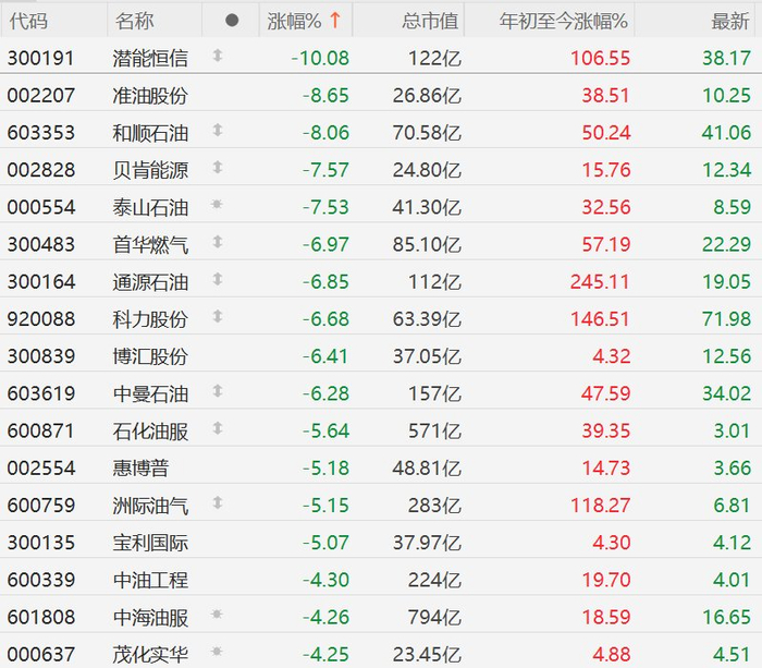 格隆汇3月20日|A股市场油气股集体下跌,其中,潜能恒信跌超10%,准油股份、和顺石油跌超8%,贝肯能源、泰山石油跌超7%,首华燃气、通源石油、科力股份、博汇股份、中曼石油跌超6%,石化油服、惠博普、洲际油气、宝利国际跌超5%。消息面上,国际油价回调,布伦特原油昨日一度冲高至112美元后回调,收报103.07美元,今日继续下跌,盘中一度跌至100.47美元。