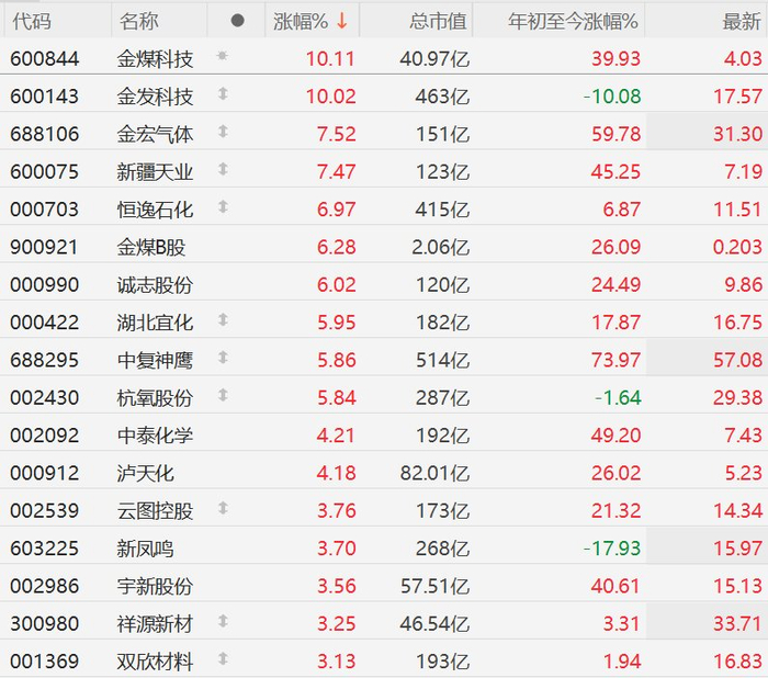 格隆汇3月23日|A股市场部分化工股逆势上涨,其中,金煤科技、金发科技涨停,金宏气体、新疆天业涨超7%,恒逸石化、金煤B股、诚志股份涨超6%,湖北宜化、中复神鹰、杭氧股份涨超5%,中泰化学、泸天化涨超4%。