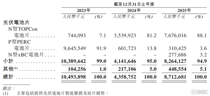 报告期内,公司P型PERC电池片的收入占比从91.9%降至3.6%;N型TOPCon电池片的收入占比从7.1%提升至88.1%;2025年8月N型xBC电池片商业化,但收入占比较低。