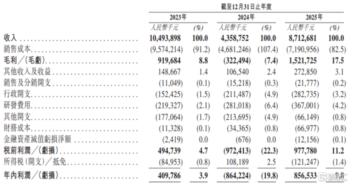 2023年、2024年和2025年,英发睿能的收入分别约104.94亿元、43.59亿元、87.13亿元,毛利率分别为8.8%、-7.4%、17.5%,对应的净利润分别约4.1亿元、-8.64亿元、8.57亿元。