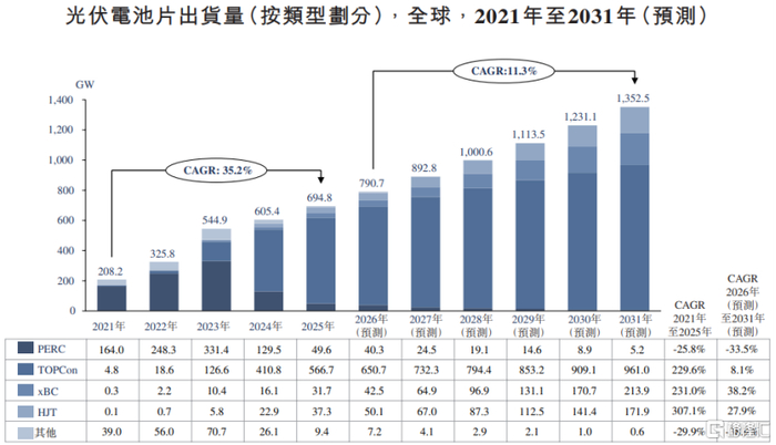 图片来源于招股书2025年全球光伏电池片出货量为694.8GW,预计到2031年将达到1352.5GW,2026年至2031年的CAGR为11.3%。