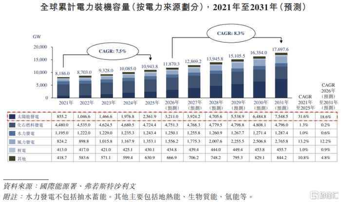 其中,2025年中国太阳能装机容量达到1201.7GW,预计到2031年将达到3609.3GW。