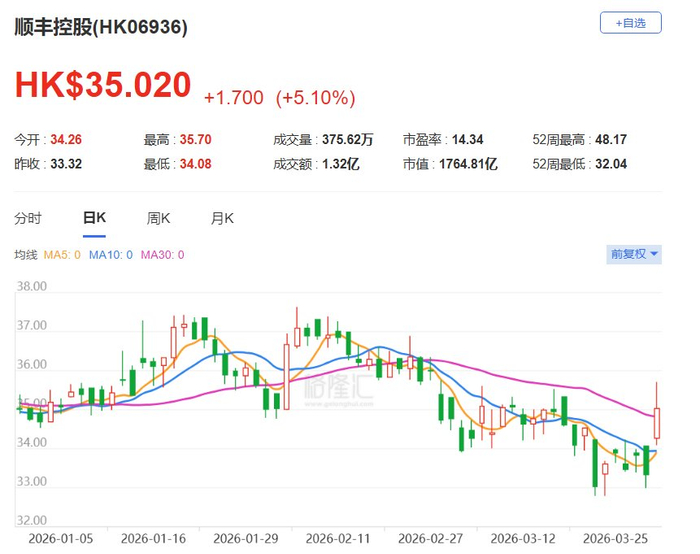 格隆汇3月31日|顺丰控股港股(6936.HK)涨超5%,报35.02港元,最高触及35.7港元;顺丰控股A股(002352.SZ)涨4%,报38.23元,创一个半月新高。