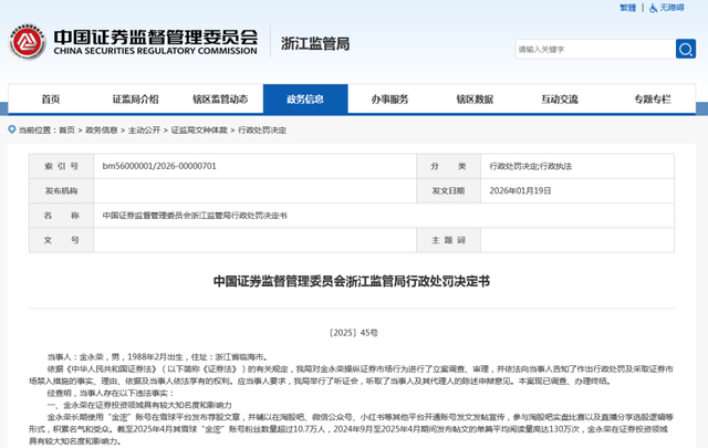 2026年1月19日,浙江证监局公布,对金永荣操纵证券市场行为“没一罚一”,罚没8325万元,同时对其采取3年证券市场禁入措施。