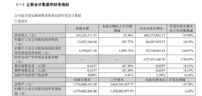 2025年第三季度单季,公司实现营收2.41亿元,同比下滑35.46%;归属于上市公司股东的净利润1385万元,同比增长107.77%;扣非后净利润879万元,同比增长1058.75%。