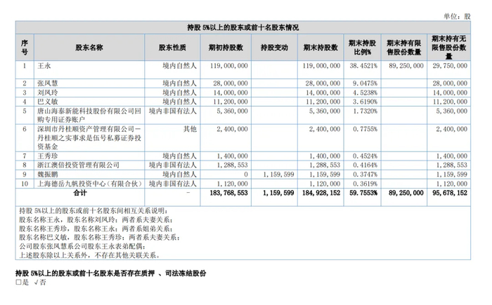 海泰新能总部位于河北唐山,属于家族型光伏企业。创始人王永持有1.19亿股,占总股本的38.4521%;张凤慧持有2800万股,占总股本的9.0475%;刘凤玲持有1400万股,占总股本的4.5238%;巴义敏持有1120万股,占总股本的3.6190%;王秀珍持有140万股,占总股本的0.4524%。