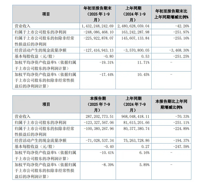 10月28日,海泰新能发布2025年三季报显示,公司2025年前三季度实现营收14.32亿元,较上上同期的24.81亿元下滑42.26%;归属于上市公司股东的净利润-2.48亿元,较上年同期盈利1.63亿元大降-251.97%;扣非后净利润-2.25亿元,较上年同期的盈利1.45亿元大降-255.16%。