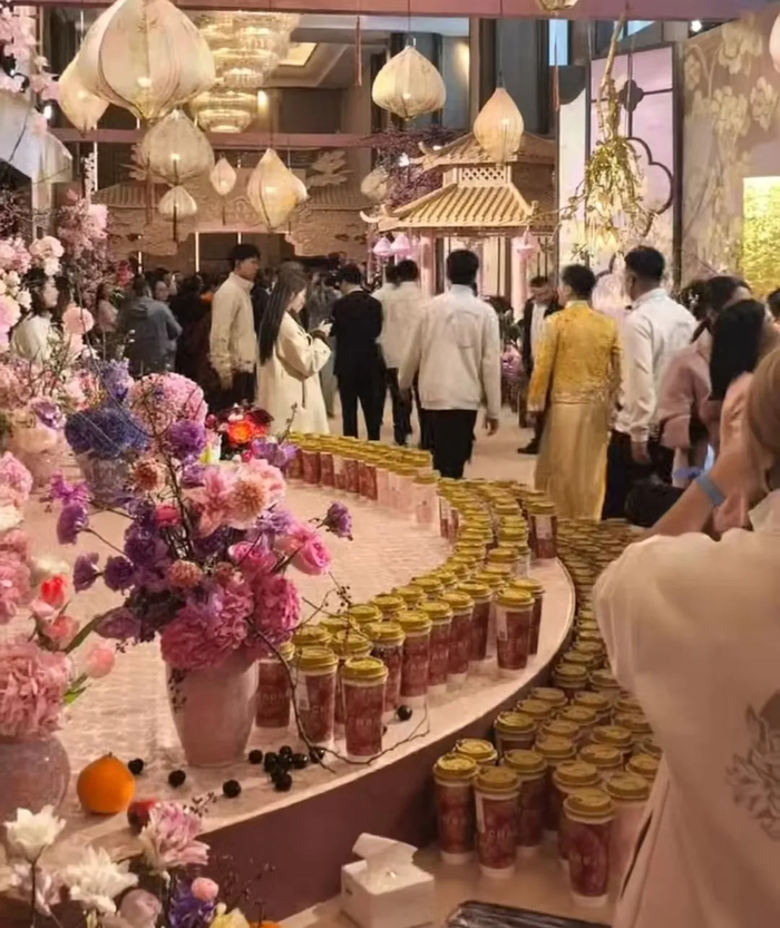 据网上消息,演员张萌受邀参加张俊杰和高海纯婚礼,婚礼现场展台摆满了霸王茶姬奶茶,这对儿新人举办的是传统的中式婚礼,新郎身着红色烫金的马褂,新娘凤冠霞帔,穿着红色烫金的长裙,气质雍容华贵。