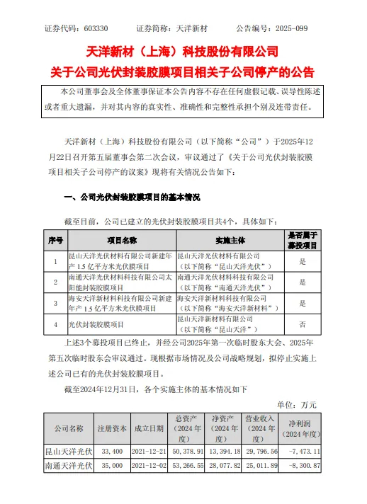 天洋新材(603330)公告称,公司于2025年12月22日召开第五届董事会第二次会议,审议通过了《关于公司光伏封装胶膜项目相关子公司停产的议案》。
