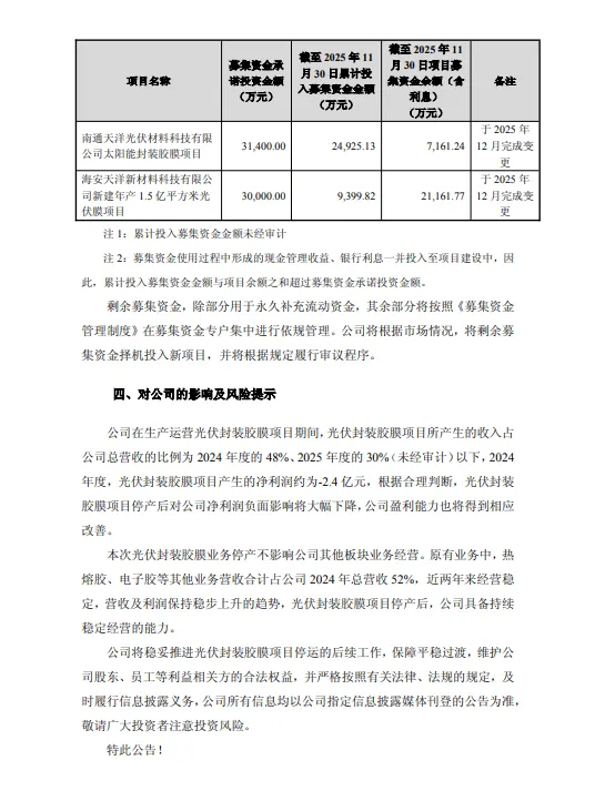 关于项目停产的影响,天洋新材表示,公司在生产运营光伏封装胶膜项目期间,光伏封装胶膜项目所产生的收入占公司总营收的比例为2024年度的48%、2025年度的30%(未经审计)以下,2024年度,光伏封装胶膜项目产生的净利润约为-2.4亿元,根据合理判断,光伏封装胶膜项目停产后对公司净利润负面影响将大幅下降,公司盈利能力也将得到相应改善。