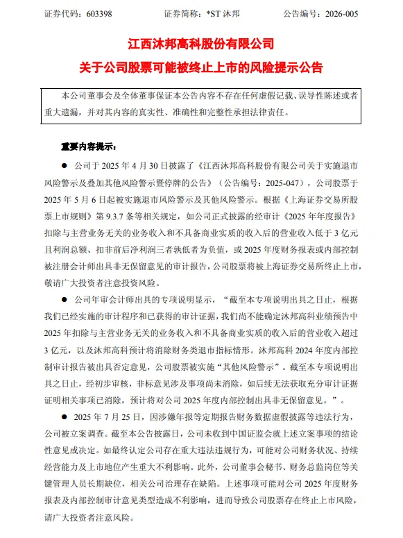 对此,*ST沐邦在公告中也表示,公司董事会秘书、财务总监岗位等关键管理人员长期缺位,相关公司治理存在缺陷。上述事项可能对公司2025年度财务报表及内部控制审计意见类型造成不利影响,进而导致公司股票存在终止上市风险。
