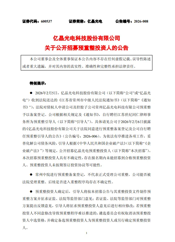 4天后2月9日,亿晶光电已着手公开招募预重整投资人的程序。公开的招募方案主要有如下几方面条件: