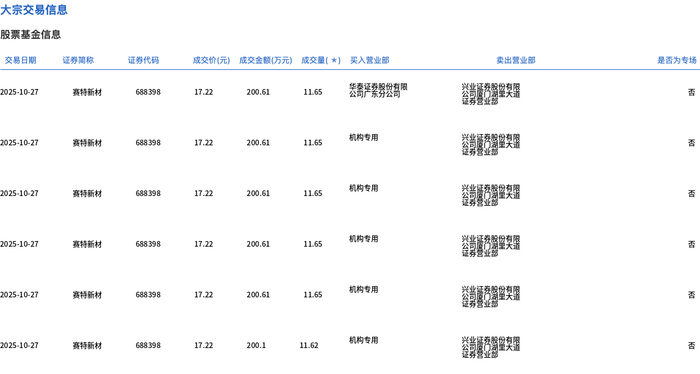 10月27日,赛特新材大宗交易成交69.87万股,成交额1203.15万元,占当日总成交额的23.96%,成交价17.22元,较市场收盘价20元折价13.9%。