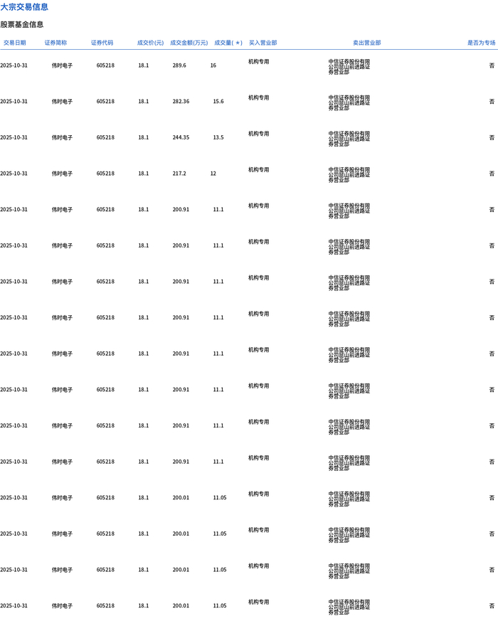 10月31日,伟时电子大宗交易成交190.1万股,成交额3440.83万元,占当日总成交额的46.97%,成交价18.1元,较市场收盘价20.34元折价11.01%。
