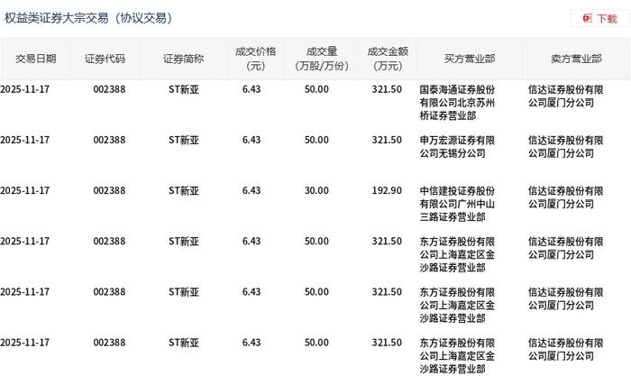11月17日,ST新亚大宗交易成交280万股,成交额1800.4万元,占当日总成交额的10.13%,成交价6.43元,较市场收盘价6.76元折价4.88%。