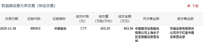 11月18日,中辰股份大宗交易成交103.29万股,成交额802.56万元,占当日总成交额的6.91%,成交价7.77元,较市场收盘价8.62元折价9.86%。