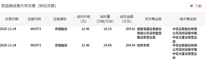 11月24日,侨银股份大宗交易成交40.1万股,成交额499.65万元,占当日总成交额的4.39%,成交价12.46元,较市场收盘价14.15元折价11.94%。