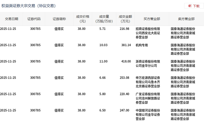 11月25日,值得买大宗交易成交45.7万股,成交额1736.6万元,占当日总成交额的0.64%,成交价38元,较市场收盘价51.2元折价25.78%。