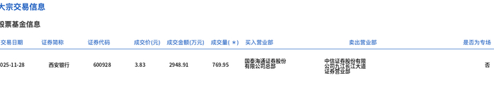 11月28日,西安银行大宗交易成交769.95万股,成交额2948.91万元,占当日总成交额的29.72%,成交价3.83元,较市场收盘价3.83元持平。