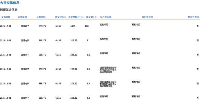 12月1日,国博电子大宗交易成交118.7万股,成交额7306万元,占当日总成交额的20.55%,成交价61.55元,较市场收盘价68.05元折价9.55%。