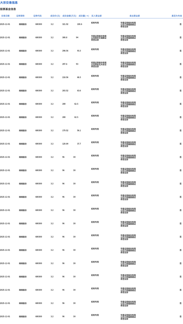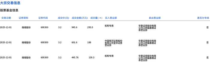 12月1日,维维股份大宗交易成交1744.4万股,成交额5582.08万元,占当日总成交额的25.2%,成交价3.2元,较市场收盘价3.62元折价11.6%。
