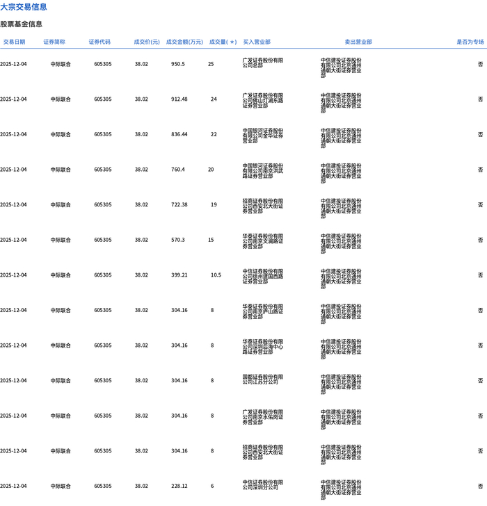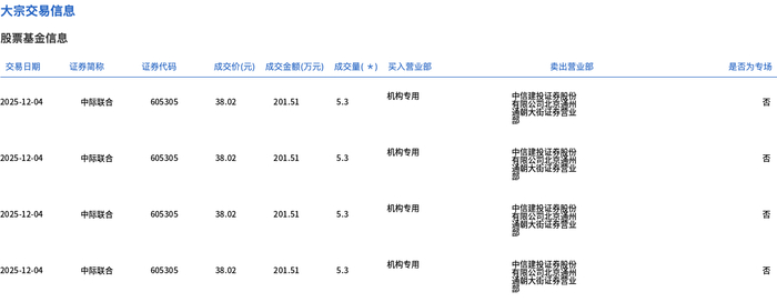 12月4日,中际联合大宗交易成交202.7万股,成交额7706.67万元,占当日总成交额的24.62%,成交价38.02元,较市场收盘价41.77元折价8.98%。