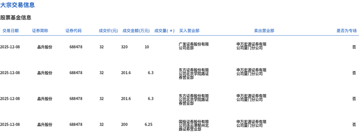 12月8日,晶升股份大宗交易成交28.85万股,成交额923.2万元,占当日总成交额的3.78%,成交价32元,较市场收盘价36.5元折价12.33%。