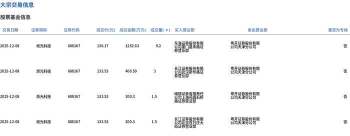 12月8日,炬光科技大宗交易成交15.2万股,成交额2053.82万元,占当日总成交额的1.43%,成交均价135.12元,较市场收盘价157.17元折价14.03%,其中最高成交价136.17元,最低成交价133.53元。