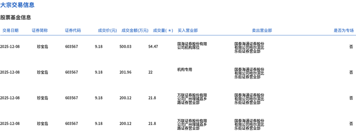 12月8日,珍宝岛大宗交易成交120.07万股,成交额1102.23万元,占当日总成交额的14.61%,成交价9.18元,较市场收盘价10.21元折价10.09%。