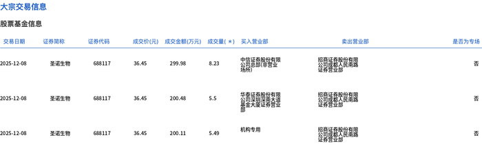 12月8日,圣诺生物大宗交易成交19.22万股,成交额700.57万元,占当日总成交额的7.67%,成交价36.45元,较市场收盘价40.56元折价10.13%。