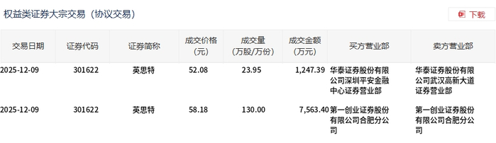 12月9日,英思特大宗交易成交153.95万股,成交额8810.79万元,占当日总成交额的50.52%,成交均价57.23元,较市场收盘价64.64元折价11.46%,其中最高成交价58.18元,最低成交价52.08元。