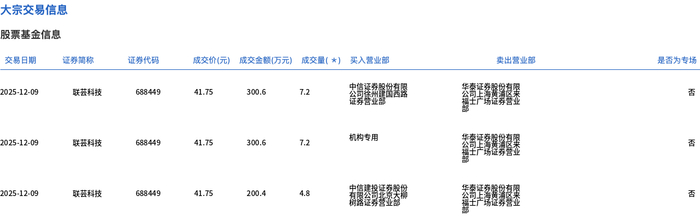 12月9日,联芸科技大宗交易成交19.2万股,成交额801.6万元,占当日总成交额的3.42%,成交价41.75元,较市场收盘价45.88元折价9%。