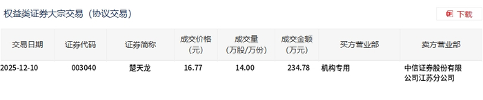 12月10日,楚天龙大宗交易成交14万股,成交额234.78万元,占当日总成交额的2.76%,成交价16.77元,较市场收盘价18.59元折价9.79%。
