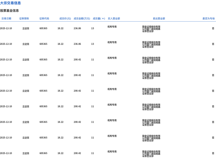 12月10日,立达信大宗交易成交103万股,成交额1876.66万元,占当日总成交额的12.58%,成交价18.22元,较市场收盘价20.59元折价11.51%。