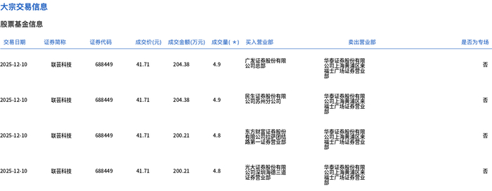 12月10日,联芸科技大宗交易成交19.4万股,成交额809.18万元,占当日总成交额的4.91%,成交价41.71元,较市场收盘价45.83元折价8.99%。