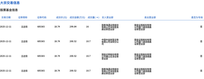 12月11日,立达信大宗交易成交48.1万股,成交额901.4万元,占当日总成交额的4.9%,成交价18.74元,较市场收盘价21.1元折价11.18%。