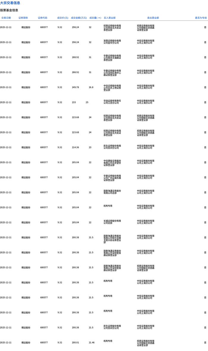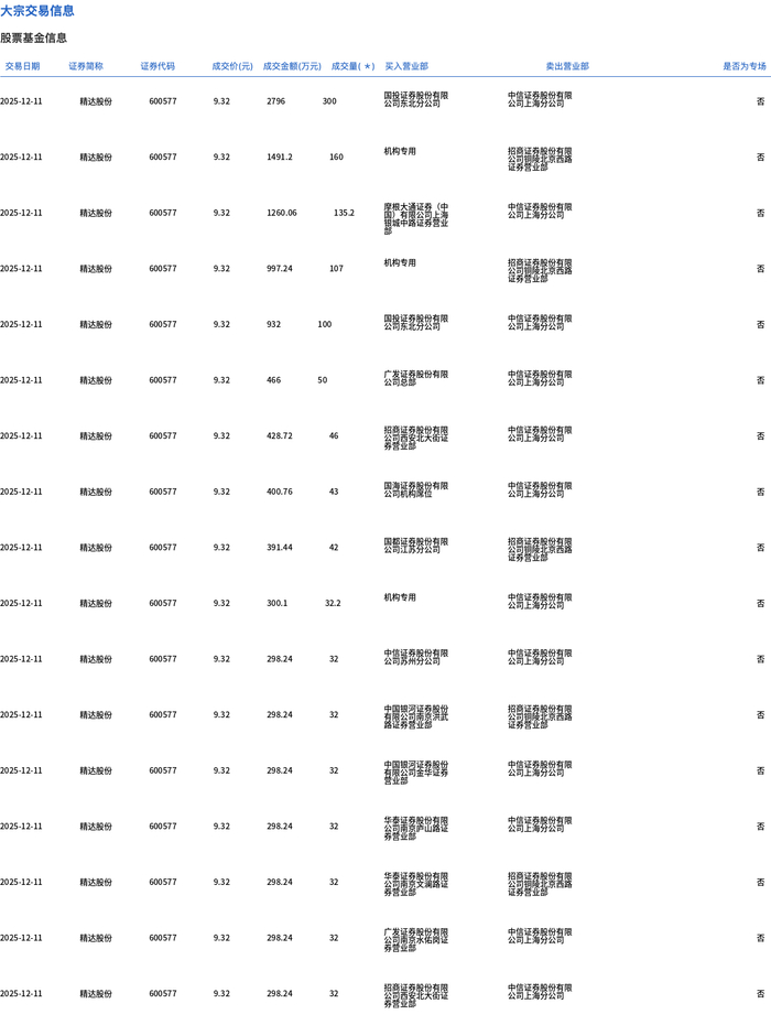 12月11日,精达股份大宗交易成交1770.16万股,成交额1.65亿元,占当日总成交额的6.16%,成交价9.32元,较市场收盘价10.98元折价15.12%。