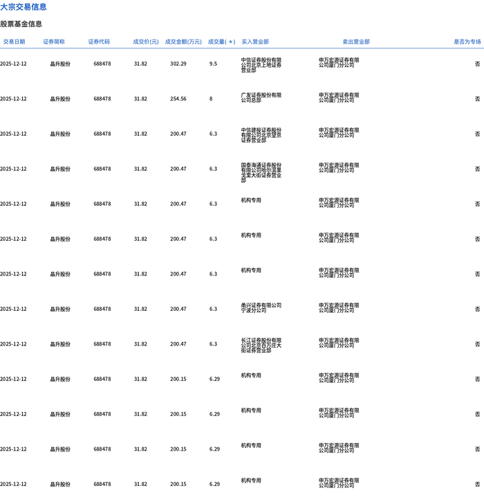 12月12日,晶升股份大宗交易成交86.76万股,成交额2760.74万元,占当日总成交额的23.41%,成交价31.82元,较市场收盘价37.04元折价14.09%。