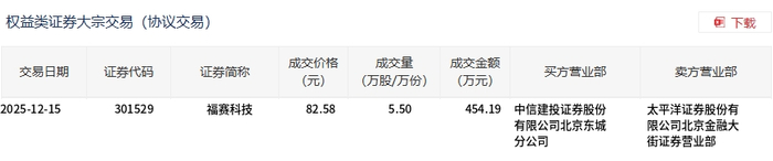 12月15日,福赛科技大宗交易成交5.5万股,成交额454.19万元,占当日总成交额的1.34%,成交价82.58元,较市场收盘价83.41元折价1%。