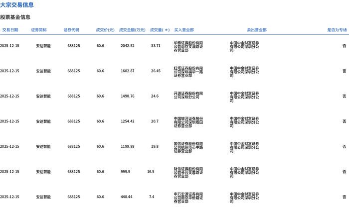 12月15日,安达智能大宗交易成交149.16万股,成交额9038.79万元,占当日总成交额的46.5%,成交价60.6元,较市场收盘价72.09元折价15.94%。