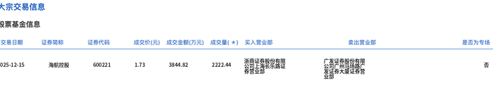 12月15日,海航控股大宗交易成交2222.44万股,成交额3844.82万元,占当日总成交额的5.16%,成交价1.73元,较市场收盘价1.75元折价1.14%。