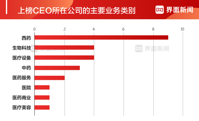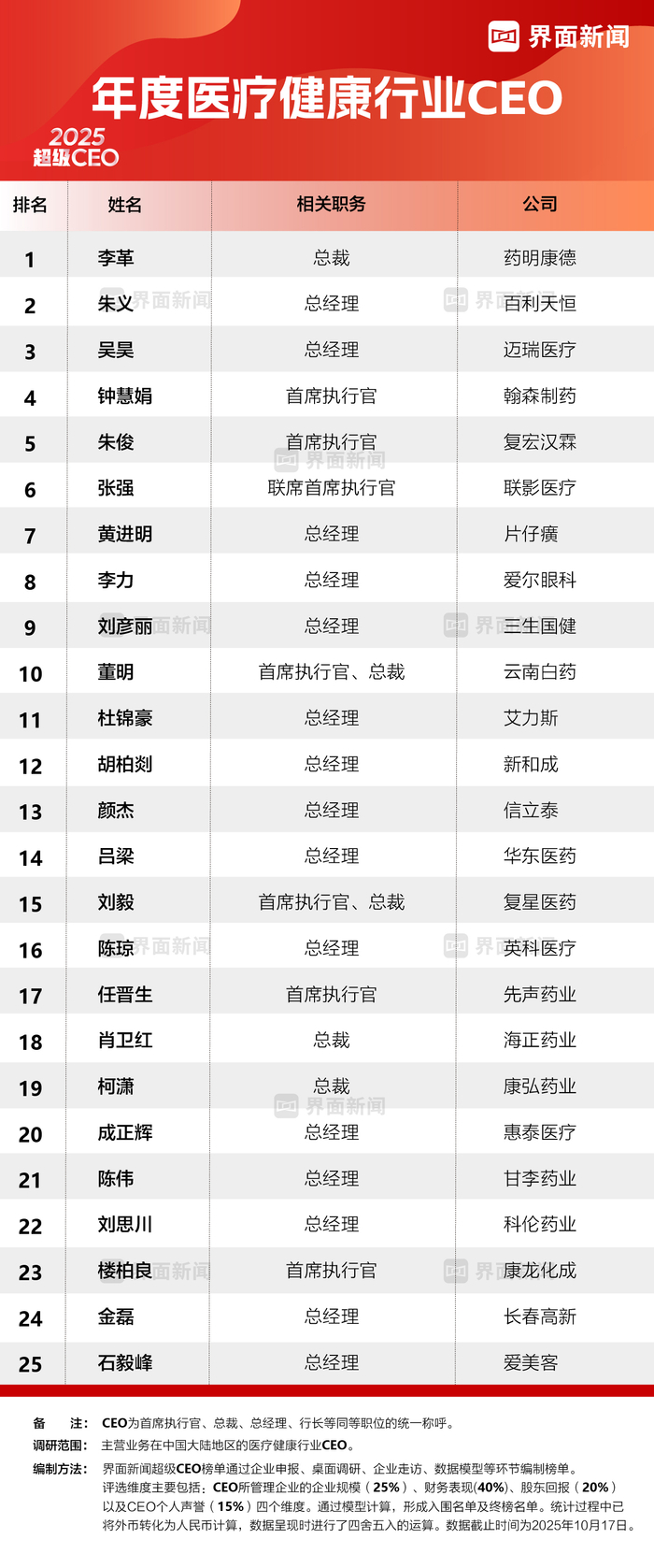本篇中CEO为首席执行官、总裁、总经理等同等职位的统一称呼。界面新闻的研究面向中国地区医疗健康企业CEO。界面新闻超级CEO榜单通过企业申报、桌面调研、企业走访、数据模型等环节编制榜单。评选维度主要包括:企业规模(25%)、财务表现(40%)、股东回报(20%)、个人声誉(15%)四个维度。通过模型估算,形成入围名单及终榜名单。统计过程中已将外币转化为人民币计算,数据呈现时进行了四舍五入的运算。