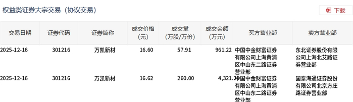 12月16日,万凯新材大宗交易成交317.91万股,成交额5282.42万元,占当日总成交额的34.2%,成交均价16.62元,较市场收盘价16.62元折价0.02%,其中最高成交价16.62元,最低成交价16.6元。