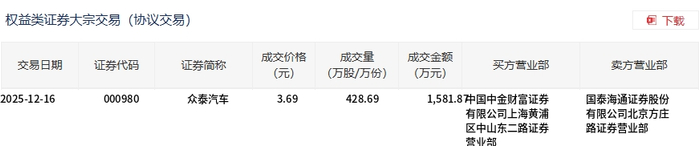 12月16日,众泰汽车大宗交易成交428.69万股,成交额1581.87万元,占当日总成交额的3.37%,成交价3.69元,较市场收盘价3.69元持平。
