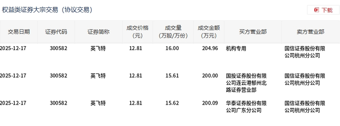 12月17日,英飞特大宗交易成交47.23万股,成交额605.05万元,占当日总成交额的6.35%,成交价12.81元,较市场收盘价14.93元折价14.2%。