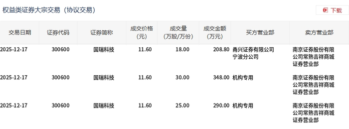 12月17日,国瑞科技大宗交易成交73万股,成交额846.8万元,占当日总成交额的6.82%,成交价11.6元,较市场收盘价14.35元折价19.16%。