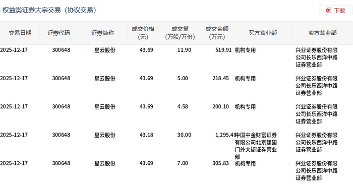 12月17日,星云股份大宗交易成交58.48万股,成交额2539.69万元,占当日总成交额的5.31%,成交均价43.43元,较市场收盘价53.99元折价19.56%,其中最高成交价43.69元,最低成交价43.18元。